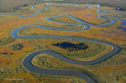 meander - (of a river or road) To follow a winding course.