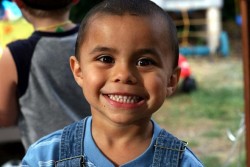 grin - Smile broadly, especially in an unrestrained manner and with the mouth open