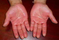 clammy - Unpleasantly damp and sticky or slimy to touch